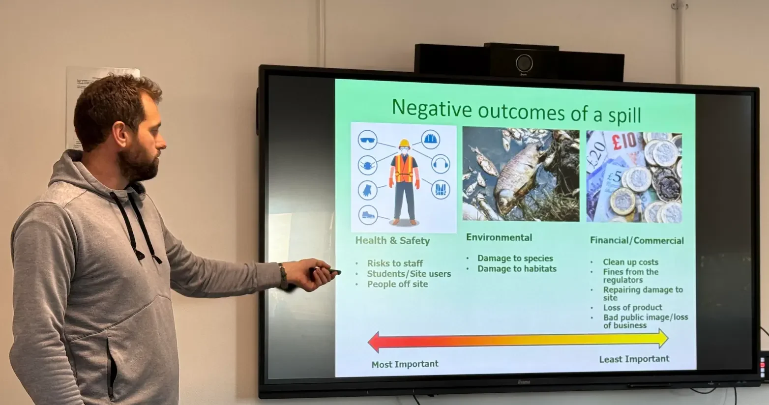 Training delegates on the hierarchy for importance when dealing with a spill protect health and safety, the environment and property.